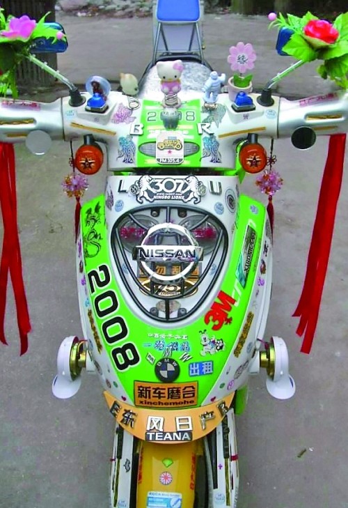 這輛電瓶車不得了,看車頭:寶馬、標(biāo)致、日產(chǎn)、東風(fēng)各種標(biāo)致全貼上了,還有可愛的helllo kitty 、snoopy等小掛飾,更加“致命”的是兩個反光鏡上還綁著兩朵大紅塑料花,就一輛電瓶車而言,可謂“風(fēng)騷”到了極點(diǎn)。