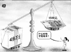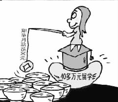 漫畫四:新浪網(wǎng)貼出的漫畫是一桿嚴(yán)重傾斜的秤,一頭是40萬(wàn)百元大鈔,一頭是1500元大鈔,題為“留學(xué)所花40多萬(wàn)元啥時(shí)才能賺夠本?”的文字說(shuō)明憂心忡忡:不吃不喝,想要賺回40萬(wàn)元得花20年。(萬(wàn)建輝)