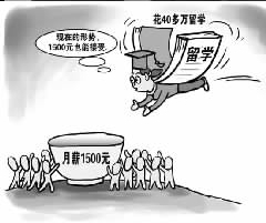 漫畫二:25日?qǐng)?bào)道發(fā)出當(dāng)天,署名李清的搜狐博客貼出題為“只要求月薪1500元的海歸不丟人”的博文,配以頭戴博士帽,以書(shū)為翅,勇敢飛向標(biāo)有1500元月薪飯碗的海歸漫畫。