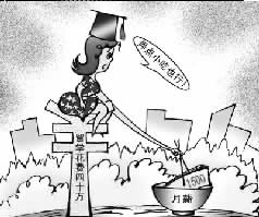 漫畫一:28日,《大眾日?qǐng)?bào)》發(fā)表評(píng)論“海歸降薪求職敲響盲目留學(xué)警鐘”,所配漫畫海歸女孩站于博士帽和40萬(wàn)元鈔票上,垂釣期望的1500元月薪。