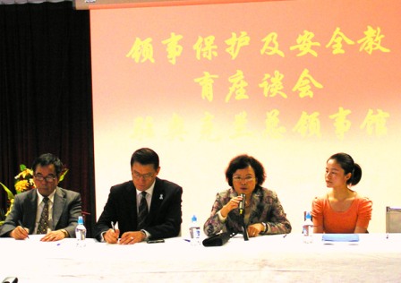中新網11月30日電 據(jù)新西蘭中華新聞通訊社消息,25日下午,中國駐奧克蘭總領館在簽證大廳舉辦了一場華人及留學生領事保護安全座談會。廖菊華總領事主持會議,工黨華人國會議員霍建強、國家黨黃徐毓芳部長助理鄭楠,以及特別邀請的三位華裔新西蘭警官出席了座談會,他們先后就如何強化華人在新西蘭的法律及自我保護意識進行講座。