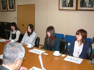 四位女留學生在28日的拜訪活動中,首先向?qū)m川良一市長做了自我介紹,并向參加對話的紋別市政府工作人員講述了自己對日本的印象。