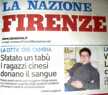 意大利主流媒體民族報(bào)(LA NAZIONE)在中國留學(xué)生無償獻(xiàn)血后,在頭版顯要位置率先發(fā)表意大利媒體界資深著名評(píng)論員喬瓦尼-斯帕諾的文章,文章以“一項(xiàng)禁忌被打破,中國人開始獻(xiàn)血,”來稱頌中國留學(xué)生為意大利社會(huì)所做出的貢獻(xiàn),稱贊中國留學(xué)生為華人社會(huì)帶了一個(gè)好頭。喬瓦尼在文章中說,本次中國留學(xué)生的獻(xiàn)血活動(dòng),象征著華人向融入意大利主流社會(huì)邁進(jìn)了一大步,并且是特別有意義的一大步。