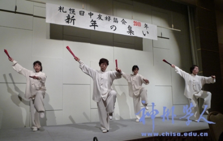 宴會(huì)中舉辦方為大家精心準(zhǔn)備的日本舞蹈——千葉玉枝博得了來(lái)賓們的陣陣掌聲與由衷贊賞。札幌太極拳協(xié)會(huì)隨后的太極梅花扇表演更是把整個(gè)宴會(huì)推向了一個(gè)高潮。來(lái)自中國(guó)的各界朋友對(duì)日本友人的認(rèn)真表演和對(duì)中國(guó)文化的宣揚(yáng)表示了由衷的贊賞與謝意。