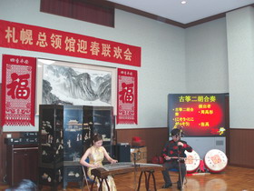 聯(lián)歡會上,表演了學友會精心組織的節(jié)目,充滿歡樂和激情的舞獅,抒情動聽的歌曲,古箏、二胡、琵琶、葫蘆絲的悠悠樂聲,典雅的日本舞蹈,歐美友人風趣的小品,令人陶醉的吉他演奏,歡快的新疆舞蹈更是將氣氛推向高潮。大家在演員們的熱情邀請下走上臺去,踏著歡快的旋律,一起跳起了奔放的舞蹈,喝彩聲,歡笑聲、掌聲匯成一片,場面熱烈,氣氛活潑。