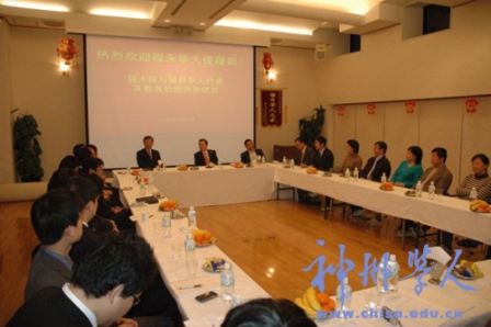 3月5日下午,新任駐日大使程永華在孔鉉佑公使的陪同下來(lái)到大使館教育處,專程看望來(lái)自東京地區(qū)東京大學(xué)等10所大學(xué)的留學(xué)生代表和留日支援西部博士專家團(tuán)、全日本中國(guó)人博士協(xié)會(huì)、在日華人汽車工程師協(xié)會(huì)、在日中國(guó)科技者同盟的負(fù)責(zé)人,并出席了與留學(xué)人員交流茶話會(huì)。教育處公使銜參贊孫建明主持了茶話會(huì)。