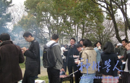 正午時(shí)分,同學(xué)們又回到賞花的大本營-----大濠公園櫻花樹下!皟(yōu)しい”的學(xué)友會負(fù)責(zé)人員已經(jīng)為大家準(zhǔn)備好了烤肉用的器具以及各種飲料。大家自覺地分成三、五人一組,圍著燒烤架邊聊天邊開始品嘗自己動手制作的美食。