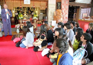 “四國(guó)大島心靈故鄉(xiāng)會(huì)”矢野都林會(huì)長(zhǎng)首先在村上水師的菩提寺和高龍寺(今治市吉海町名)迎接了大家,并給大家介紹了四國(guó)大島的基本情況;隨后,留學(xué)生們步行6公里,走訪了38所名剎;夜里,大家就寄宿在島上的民居旅館“善根驛站”,晚餐則品嘗到了島上志愿者親手制作的美味。