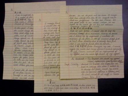 “…此時此刻,我希望專心于洗脫目前我被指控的罪名。長故事短說,他們(校方)將我的電話上的講話斷章取義,指控我“恐怖威脅” (他寫terrorist threat 而非檢方指控的terroristic threat) 。當我問他們(校方)原因時,史蒂文斯(技術學院)回避我的問題只是回答我“你應該小心你的嘴”。之后,史蒂文斯(技術學院)學生發(fā)展部助理副總史德利(Joseph Stahley) 更回應說“我有主導權! (I have the floor)”。“當時我不明白(他指什么),他接著解釋說,這是一句美國俚語,意思是現(xiàn)在是我負責!…”