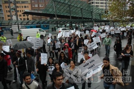 中新網(wǎng)6月7日電 據(jù)澳大利亞新快網(wǎng)報(bào)道,為抵制聯(lián)邦移民部推出的新的職業(yè)技術(shù)清單(SOL),以及抗議所受的不公平對(duì)待,近200名國(guó)際學(xué)生3日冒雨走上悉尼街頭,高舉標(biāo)語(yǔ)振臂疾呼。不過(guò),一名來(lái)自私立學(xué)校的中國(guó)女生Annie表示,“我原以為人會(huì)更多的”,可謂一針見(jiàn)血。
