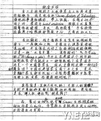 海明律師給本報傳來了翟田田親筆寫的聲明掃描件。翟在信中說, 檢方指控官在沒有證據(jù)的前提下,拒絕他上訴,還提出無理要求故意刁難,在保金已付的情況下仍拒絕他的保釋,稱這是一種“以言定罪”、“提前服刑”的逼供手段。