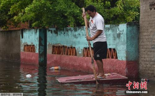 巴拉圭首都遭遇洪水襲擊 男子把床墊當(dāng)“竹筏”