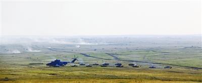 俄米-26直升機(jī)為中俄兩軍步兵戰(zhàn)車、坦克實(shí)施油料補(bǔ)給。本報(bào)記者 羅錚攝
