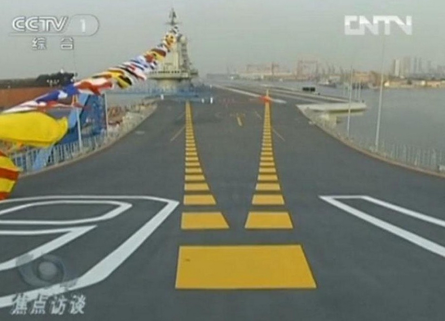 中國(guó)首艘航母滑躍甲板。(央視截圖)