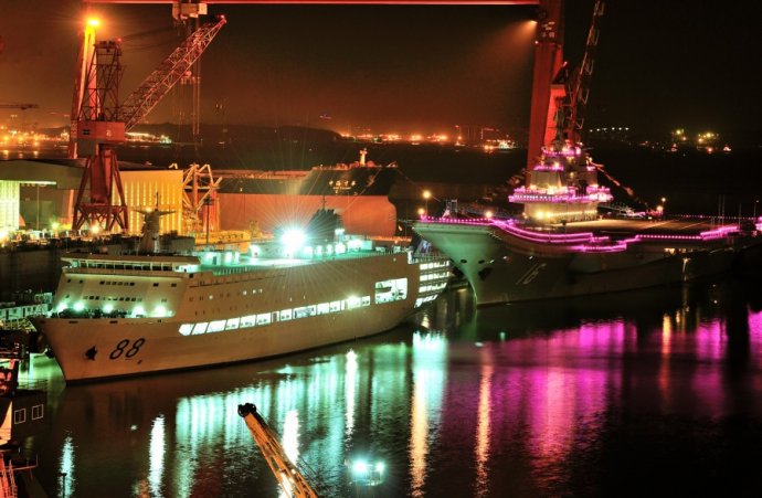 網(wǎng)友拍我航母平臺“遼寧艦”節(jié)日期間霓虹燈閃亮裝點(diǎn)海灣