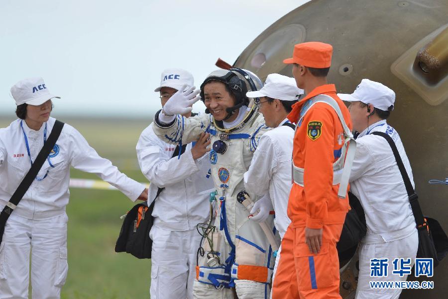 6月26日,航天員聶海勝自主出艙后揮手致意。當日,神舟十號載人飛船返回艙在內(nèi)蒙古主著陸場成功著陸,3名航天員身體狀況良好。天宮一號與神舟十號載人交會對接任務取得圓滿成功。新華社記者 張領 攝 圖片來源:新華網(wǎng)