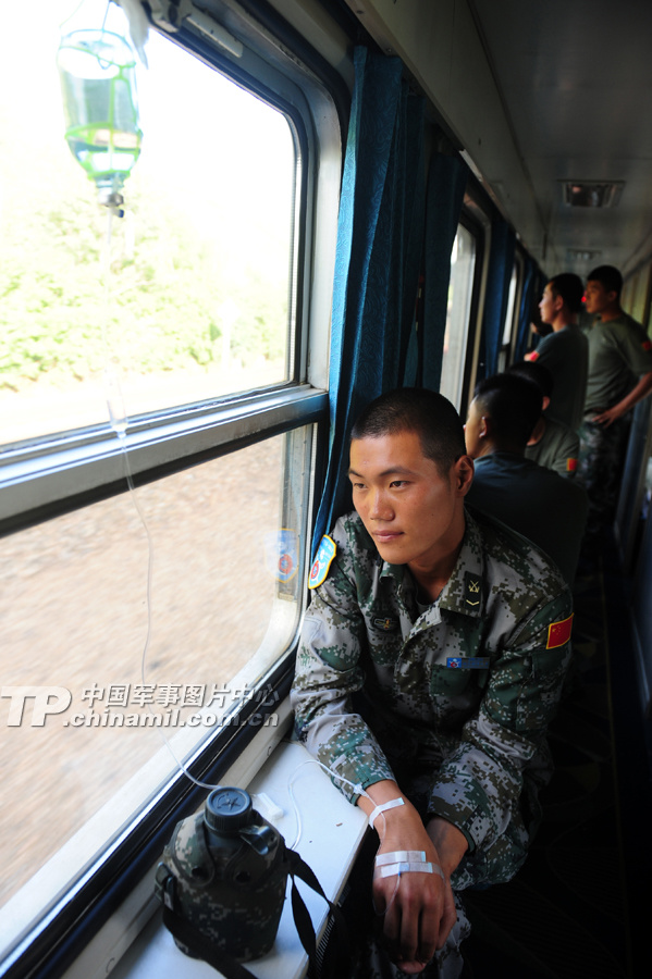 一名戰(zhàn)士在投送列車上打點滴,生病期間他沒落下一次訓練。蓋旭輝 攝