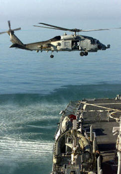 美海軍SH-60“海鷹”直升機主要用于反潛、反艦攻擊,搜索與救援等任務。它由驅(qū)逐艦搭載,“海鷹”可以裝備聲波定位器、MK46或MK50型魚雷、AGM-119型“企鵝”導彈及50口徑機炮等。