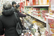 紐約東百老匯的中國(guó)城超市、香港超市也擠滿了買年貨的僑胞,其中以閩籍鄉(xiāng)親占多數(shù)。為吸引福州人,貨架上有多種從福建來(lái)的年貨。中國(guó)城超市一名員工說(shuō),年貨潮上個(gè)星期已經(jīng)開(kāi)始了,福州鄉(xiāng)親好像怕遲買會(huì)賣光似的,都趕著一包兩包買回去,“中國(guó)人都要面子,過(guò)年不想失禮親朋的”。