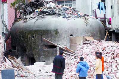 據(jù)人民網(wǎng)報道,漢口建設(shè)大道旁金惠公寓居民劉先生昨日憑欄遠眺時,突然發(fā)現(xiàn)建設(shè)大道拓寬工程拆遷處露出一座三四米高,如天文臺頂一般的圓頂龐然大物,仔細觀察,竟是一座碉堡。