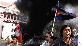 示威者焚燒了泰國國旗,并呼喊反泰口號。傍晚時分,人群聚集在泰國大使館外。柬埔寨警察對天鳴槍,希望能夠驅(qū)散人群。