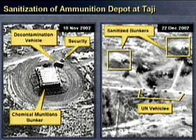 他說(shuō),伊拉克在核查員抵達(dá)前轉(zhuǎn)移了可疑的生化武器設(shè)備。他所提交的人造衛(wèi)星拍攝的照片,顯示伊拉克擁有“違禁材料”,他還播放電話錄音,顯示伊拉克軍官要求銷(xiāo)毀證據(jù)的對(duì)話和做假證以及關(guān)于毒氣的內(nèi)容。