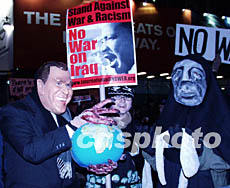 當?shù)貢r間二月五日,在鮑威爾向聯(lián)合國提交伊拉克擁有大規(guī)模殺傷性武器新證據(jù)的同時,數(shù)百人在紐約時代廣場集會,反對美國對伊拉克開戰(zhàn)。傍晚時,越來越多下班的紐約人自動加入,集會遂演變?yōu)檠刂氖中羞M的反戰(zhàn)示威游行。圖為帶著布什面具的示威者。作者:龔文謨