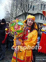法國華人社團(tuán)新春聯(lián)合組織的盛大彩妝巡游在巴黎十三區(qū)舉行,法國人和華人一道歡天喜地慶新春。圖為舞龍隊的女指揮。作者:蔚中