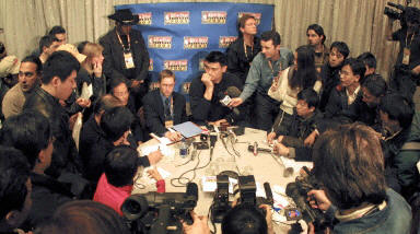 當?shù)貢r間2月7日,NBA全明星賽在亞特蘭大舉行記者招待會。姚明在記者會上回答來自全世界各國媒體記者的提問。文章說,在接受采訪的時候,眾多的攝像機都在等待著他的出現(xiàn),他出現(xiàn)后,全場鎂光燈頻閃,而為了讓他到桌前接受記者的提問,工作人員必須為他艱難的開辟一條路。