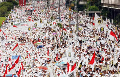 9日在印尼雅加達爆發(fā)大規(guī)模反美反戰(zhàn)示威,超過5000名穆斯林走上街頭,在美國大使館外抗議美國準備對伊拉克使用武力。