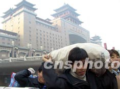 一隊肩扛大包的民工慶幸抵達了北京。據(jù)中國鐵道部春運辦的消息,僅2月7日,中國鐵路旅客發(fā)送量達426.4萬人次,創(chuàng)歷史新高。預計春節(jié)后第二個客流高峰將在二月中旬出現(xiàn),目前許多車站已無票可售。作者:杜洋