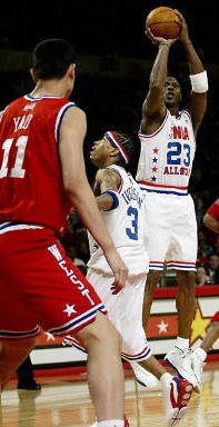 在本場(chǎng)比賽中,西部全明星隊(duì)的加內(nèi)特成為本方取勝的頭號(hào)功臣,他獨(dú)得全場(chǎng)最高分37分,另外,他有9個(gè)籃板5次搶斷和三次助攻。西部的后衛(wèi)科比-布萊恩特和弗朗西斯分別拿下了22分和20分,他們的助攻分別為7次和9次。得分超過兩位數(shù)的還有鄧肯和奧尼爾,他們都拿下了19分。中國(guó)球員姚明上場(chǎng)17分鐘,一投一中兩個(gè)籃板得到兩分。在東部聯(lián)盟中,艾弗森摘下35分,麥克格雷迪貢獻(xiàn)29分,喬丹20分5個(gè)籃板兩次助攻。這樣,喬丹在NBA全明星賽上的總得分已達(dá)到262分,打破了18次參加全明星賽的“天鉤”賈巴爾的251分的全明星賽總得分紀(jì)錄。
