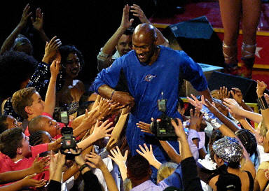 中場(chǎng)休息時(shí),美國(guó)著名流行歌曲天后瑪利亞-凱莉身著喬丹的23號(hào)戰(zhàn)袍,為這位籃壇的神一般的傳奇人物獻(xiàn)歌。隨后瑪利亞-凱莉介紹喬丹出場(chǎng),喬丹受到了全場(chǎng)球迷的歡呼,全場(chǎng)球迷都起立向他致敬。喬丹發(fā)飆了談話,對(duì)球迷表示了感謝,感謝家庭,感謝球迷對(duì)他的支持。喬丹表示,我現(xiàn)在把火炬?zhèn)鹘o年輕人,就象我從約翰遜等人傳給我一樣。隨后,他與其他全明星隊(duì)員一一擊掌致意。