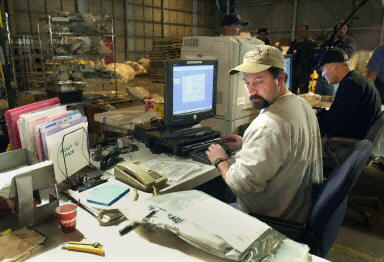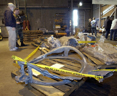 10日,美國洛杉機(jī)巴科斯德勒空軍基地,哥倫比亞號(hào)聯(lián)合調(diào)查組人員對(duì)收集來的殘骸進(jìn)行分析比對(duì),試圖找出哥倫比亞航天飛機(jī)失事的原因。