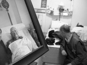 協(xié)和醫(yī)院A級二病房里袁先生病床的床頭上還掛著兩排醒目的賀年卡,其中一張寫著“早日康復(fù),壽比南山”的卡片是袁先生兒子袁偉承寄來的。病床邊上的病歷本詳細(xì)記錄著袁先生住院期間每天的病況。在病房里,還放著一張?jiān)壬诓≈信c兒子袁偉承的大合影,照片上的袁先生笑得很燦爛。