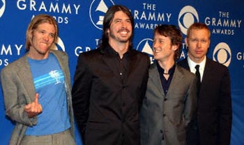 “FOO FIGHTER”樂(lè)隊(duì)?wèi){借《All My Life》獲得最佳硬搖滾演奏獎(jiǎng)。樂(lè)隊(duì)靈魂人物主唱戴夫(圖中左二)是90年代紅遍全球的著名非主流樂(lè)隊(duì)Nirvana(涅磐)的鼓手。