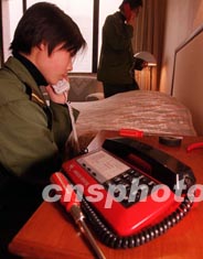 北京保障京西賓館通信的解放軍女兵,目前正在緊張檢修電話,以確保參加中國人大和政協(xié)“兩會”的代表、委員通信萬無一失。作者:宋吉河