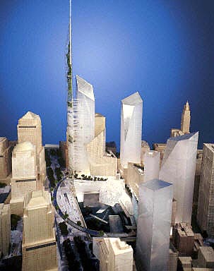 美國建筑師丹尼爾·利貝金斯德準(zhǔn)備在紐約世貿(mào)中心廢墟上,興建532.8米的世界最高尖塔大樓的構(gòu)想,26日獲得評選人員的青睞。