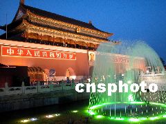 北京市政府有關(guān)部門26日透露,為了迎接全國“兩會(huì)”召開,從2003年3月2日至3月19日,北京全市范圍內(nèi)按重大節(jié)日要求開放夜景照明設(shè)施,開燈時(shí)間為每天18時(shí)30分至23時(shí)。圖為天安門夜景。郎從柳 攝