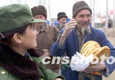 新疆地震災(zāi)區(qū)救災(zāi)的解放軍官兵,時常把自己的食品、現(xiàn)金接濟(jì)特困災(zāi)民。作者:宋吉河