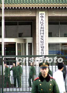 備受各界關(guān)注的國(guó)務(wù)院機(jī)構(gòu)改革方案六日上午提請(qǐng)十屆全國(guó)人大一次會(huì)議審議。根據(jù)這一方案,國(guó)家發(fā)展計(jì)劃委員會(huì)將改組為國(guó)家發(fā)展和改革委員會(huì),以完善宏觀調(diào)控體系。圖為武警戰(zhàn)士三月在國(guó)家計(jì)委前執(zhí)勤。作者:羅杰