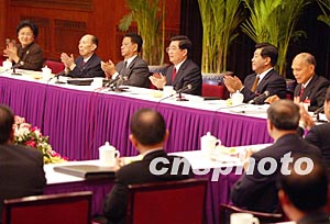 中共中央總書(shū)記胡錦濤今天上午來(lái)到全國(guó)政協(xié)禮堂會(huì)議室,親切看望了出席全國(guó)政協(xié)十屆一次會(huì)議的港澳地區(qū)政協(xié)委員,并參加了他們的聯(lián)組討論。中共中央政治局常委賈慶林參加了看望和聯(lián)組會(huì)議。