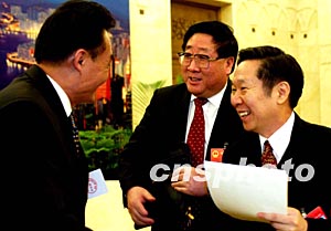 國(guó)務(wù)院港澳辦副主任陳佐洱(右一)七日參加香港人大代表團(tuán)分組討論,與吳邦國(guó)、高祀仁(右二)交談。作者:鄭萍萍