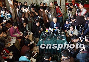 準(zhǔn)三點(diǎn)鐘,吳敬璉教授來到現(xiàn)場(chǎng),身穿西服,不系領(lǐng)帶,頭發(fā)紋絲不亂。他從記者群中擠了進(jìn)去,面對(duì)不停閃光的鏡頭,他神閑氣定,極其認(rèn)真地回答著記者們提出的每一個(gè)問題。
