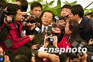 中國(guó)勞動(dòng)和社會(huì)保障部部長(zhǎng)張左己十二日在十屆全國(guó)人大舉行的中外記者招待會(huì)結(jié)束后,被眾多提問(wèn)記者包圍。作者:張煒