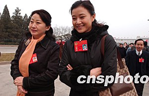 全國(guó)政協(xié)委員、軍營(yíng)歌手宋祖英(右)三月十三日參加全國(guó)政協(xié)十屆一次會(huì)議第四次全體會(huì)議。本次會(huì)議將選舉產(chǎn)生新一屆全國(guó)政協(xié)主席。作者:張煒