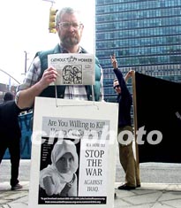 當(dāng)?shù)貢r(shí)間三月十七日上午,聯(lián)合國(guó)內(nèi)伊拉克問題上的外交斗爭(zhēng)正式結(jié)束。美、英、西宣布,放棄在安理會(huì)上對(duì)伊拉克最后通牒議案進(jìn)行表決的努力。在聯(lián)合國(guó)總部門前,一名反戰(zhàn)者身掛伊拉克殘疾少女畫像的表語牌,上書:“為抓住薩達(dá)姆,你想殺死她嗎”?作者:陳