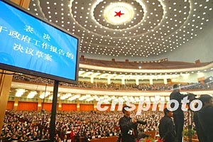 圖:十屆全國(guó)人大一次會(huì)議通過政府工作報(bào)告等決議草案
