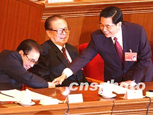 新當(dāng)選的中國國家主席胡錦濤,三月十八日在十屆人大一次會(huì)議的閉幕式上,向九屆全國人大委員長李鵬握手致謝。作者:賈國榮