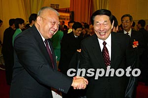 十屆人大一次會(huì)議十八日上午在北京人民大會(huì)堂閉幕,出席會(huì)議的香港特別行政區(qū)行政長(zhǎng)官董建華與前總理朱镕基話別。作者:毛建軍